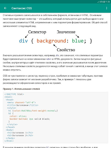 - Селектор — это HTML-тег, к которому будет применяться стиль. Это может быть любой тег, например, <h2> или <table> и т.д.