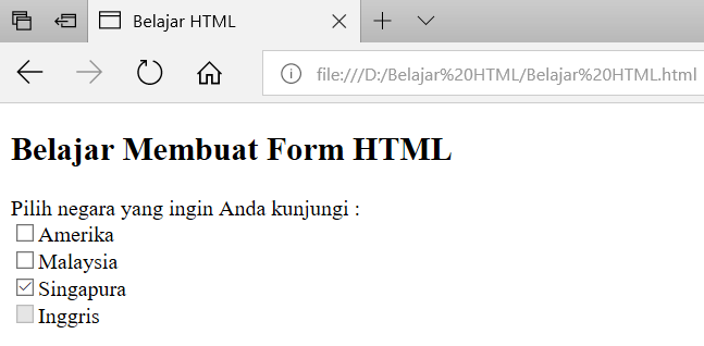 В данном примере мы указали для элемента <input> с типом радио-кнопка (type = «radio») и флажок (type = «checkbox») атрибут checked. Для одного элемента мы указали атрибут disabled, который не дает нам сделать выбор (элемент отключен).
