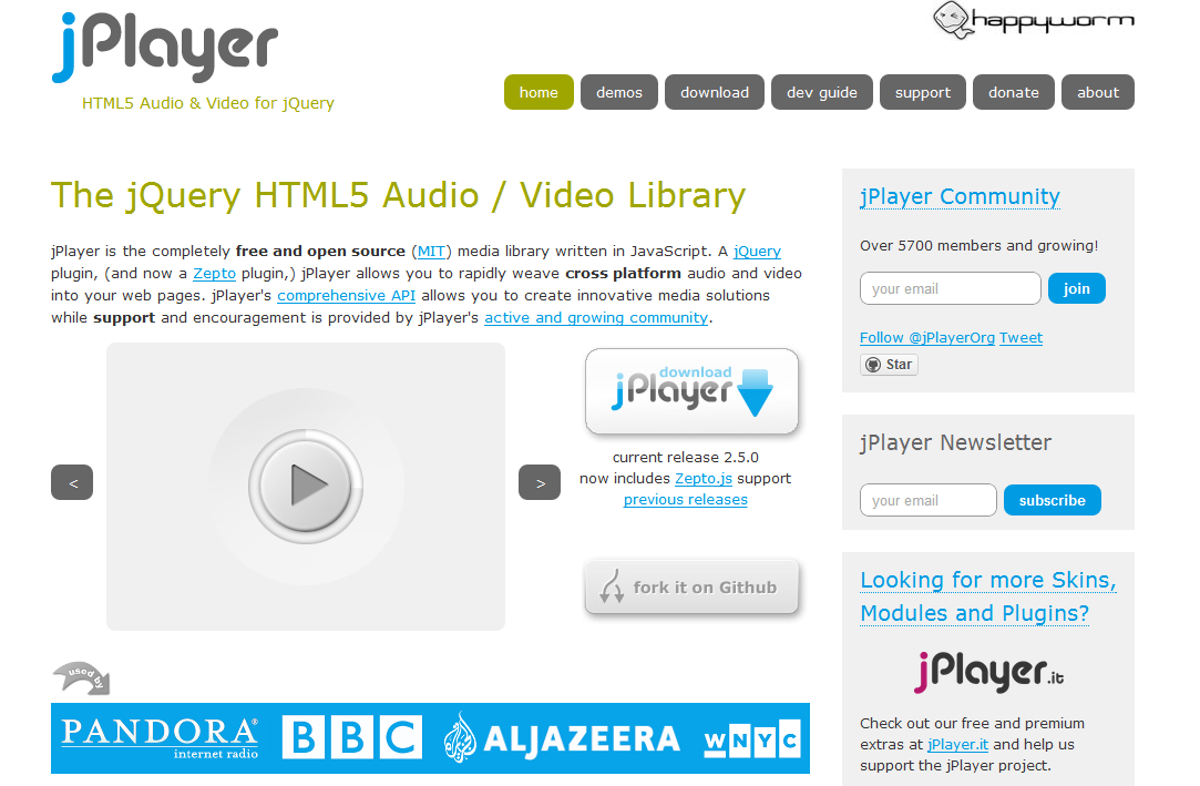 jPlayer —это бесплатная медиа-библиотека с открытым исходным кодом, написанная на JavaScript.