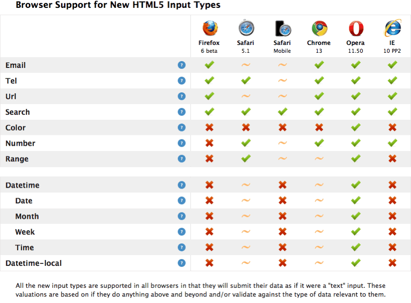 Использование Caniuse для функций формы HTML5, чтобы понять, как эти новые функции формы поддерживаются различными версиями браузера, как показано ниже.