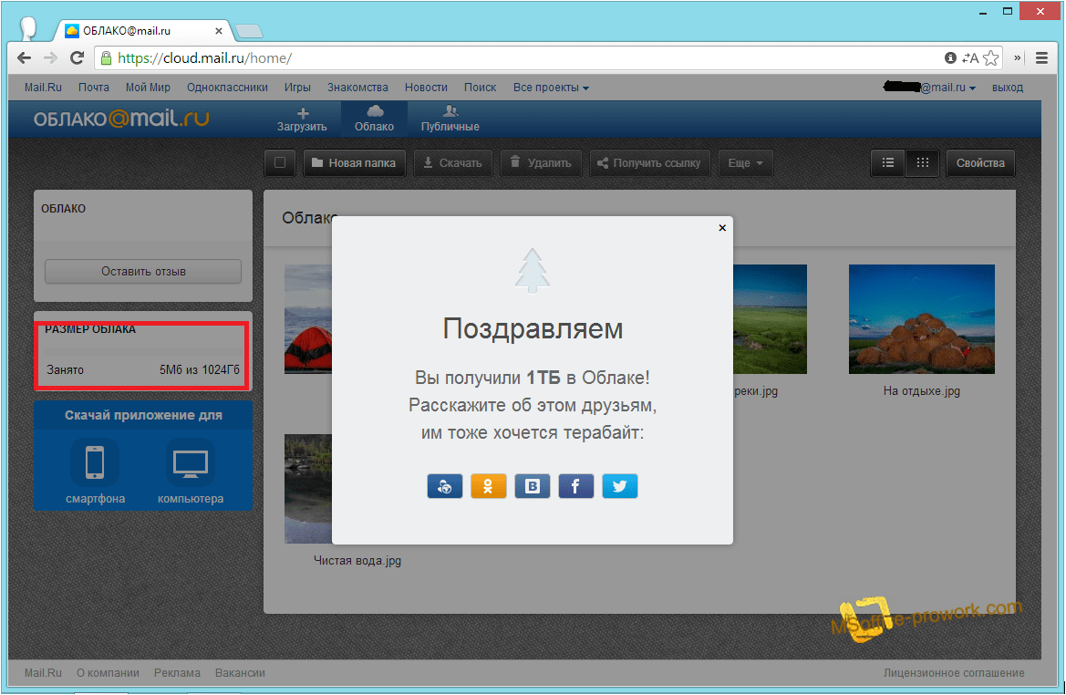 Для получения этого самого терабайта на файлообменнике Mail.Ru нужно зайти на сервис по ссылке: