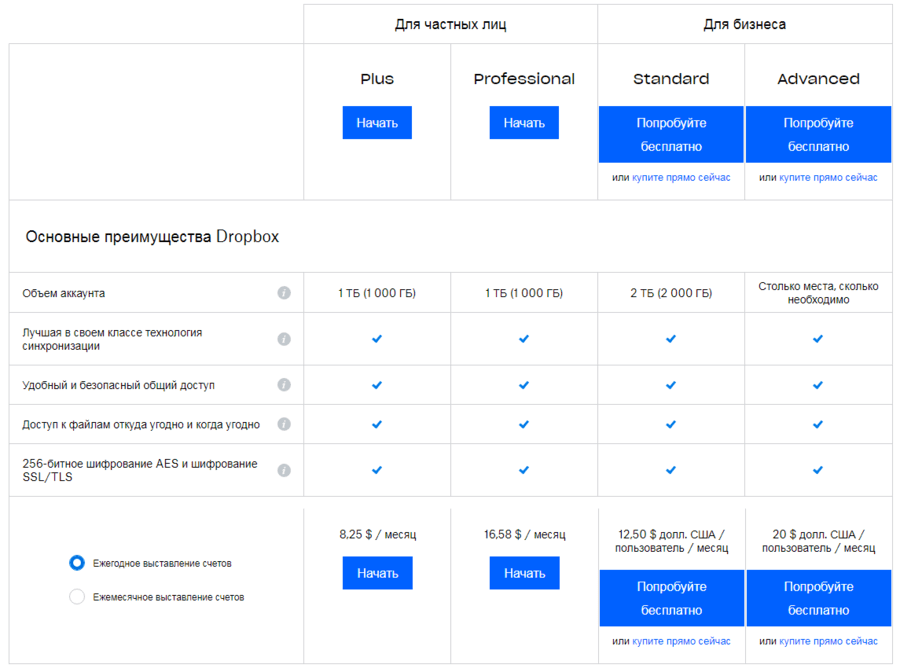 Но для коммерческих клиентов Dropbox будет очень кстати. Если вы подключите тариф Advanced за $25 в месяц, то ограничения на количество памяти просто исчезнут.