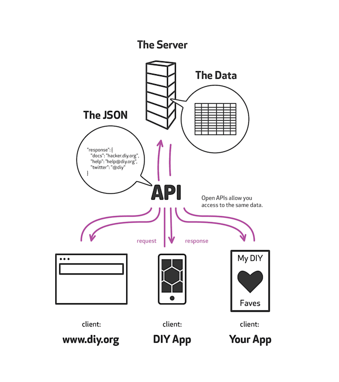 Вызов API состоит из трех частей: запрос, отправляемый клиентом, извлечение запрошенной информации и доставка этой информации с сервера клиенту. Как пользователь API, вам нужно беспокоиться только о первоначальном запросе.