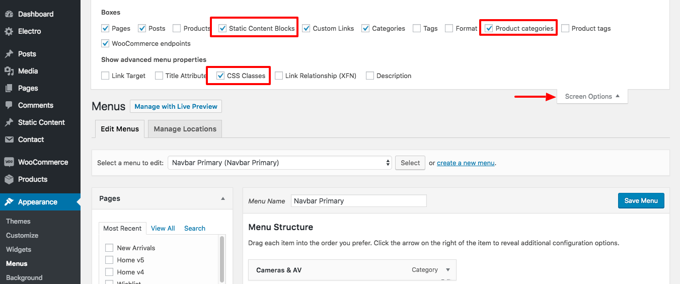 Сначала вам нужно посетить страницу Внешний вид » Меню и щелкнуть вкладку «Параметры экрана» в правом верхнем углу экрана.