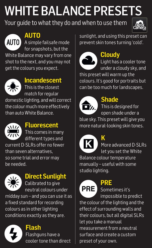 К счастью, большинство цифровых камер содержат множество предустановленных балансов белого, так что вам не придется иметь дело с цветовой температурой и зелено-пурпурным сдвигом во время критического снимка. Обычно используемые символы для каждого из них перечислены слева.