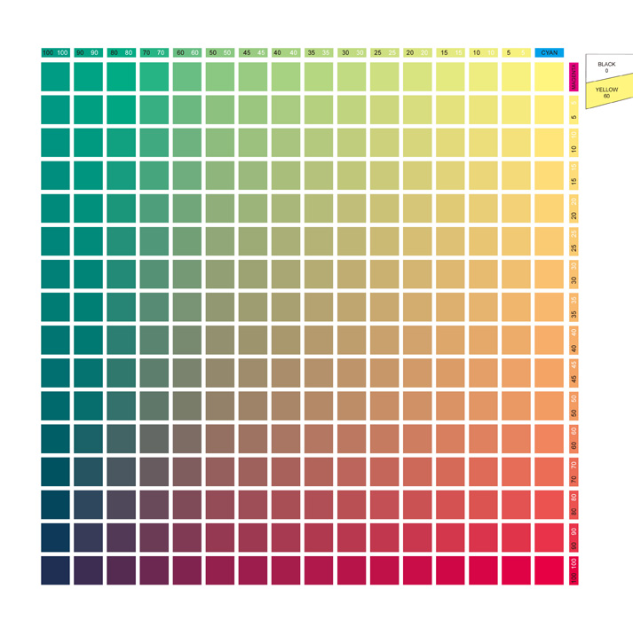 Тоновую насыщенность цвета, также называемую интенсивностью или плотностью, в Палитре CMYK принято выражать в %, в отличие, например от палитры RGB, где интенсивность цвета выражена числовым рядом от 0 до 255.