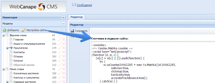 В разделе «Настройка сайта» добавить код в поле «Счетчики в подвале сайта» выше или ниже кода счетчиков Яндекс.Метрики или Google Adwords. После добавления кода остается нажать на кнопку «Сохранить», и онлайн консультант Jivo появится на вашем сайте. Предварительно проверить работоспособность кода при добавлении вы можете на демо-версии Canape CMS, зайдя в панель управления сайтом.