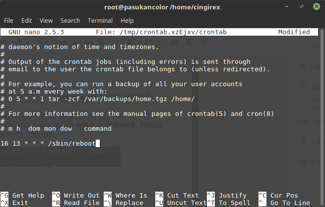 Это откроет файл crontab в вашем любимом редакторе, расположенном в /var/spool/cron/crontabs/edward (edward — это наше имя пользователя в этом примере, оно может отличаться в вашем случае). Вывод приведенной выше команды будет (наш редактор здесь nano):