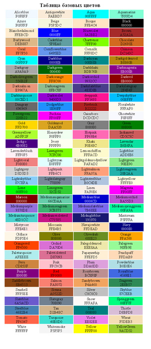 Если изменять каждую пару, то получается: #FF0000 — самый яркий красный, #00FF00 — самый яркий зеленый и #0000FF — самый яркий синий. Соответственно, #00FFFF — самый яркий голубой, #FF00FF — самый яркий пурпурный и #FFFF00 — самый яркий желтый.