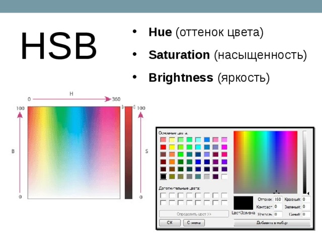 Существуют и другие цветовые модели, построенные аналогично HSV, например модели HLS (Hue, Lighting, Saturation) и HSB также использует цветовой конус. В модели HSB тоже три компонента: оттенок цвета (Hue), насыщенность цвета (Saturation) и яркость цвета (Brightness). Регулируя их, можно получить столь же много произвольных цветов, как и при работе с другими моделями.
