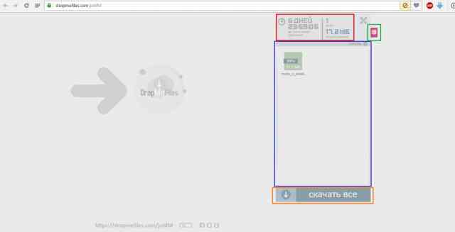 Загрузка: нажимаем посередине круга Дропмифайлс. Откроется окошко с файлами, выбираем и загружаем. Скорость загрузки зависит от объема файла (чем больше файл, тем дольше загружается).
