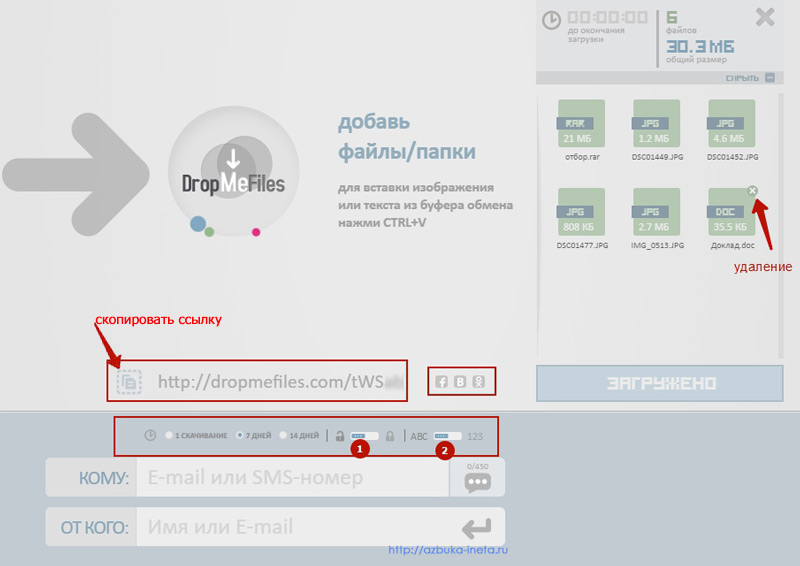 Также можно поставить код защиты, чтобы не допустить до линка кого-то третьего. Пароль покажется возле ссылки. После загрузки можете скинуть линк собеседнику любым удобным способом — по почте, в социальных сетях или даже с помощью SMS сообщения. Отправить ссылку можно через обменник. Для этого нужно ввести адрес почты или номер телефона в поле “Кому”, а свой адрес или имя нужно вписать в поле “От кого”. Можно отправить самому себе.