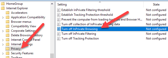 Конфигурация компьютера/Конфигурация пользователя/Административные шаблоны/Компоненты Windows/Internet Explorer - Выберите Конфиденциальность , щелкните правой кнопкой мыши Отключить просмотр InPrivate, и выберите