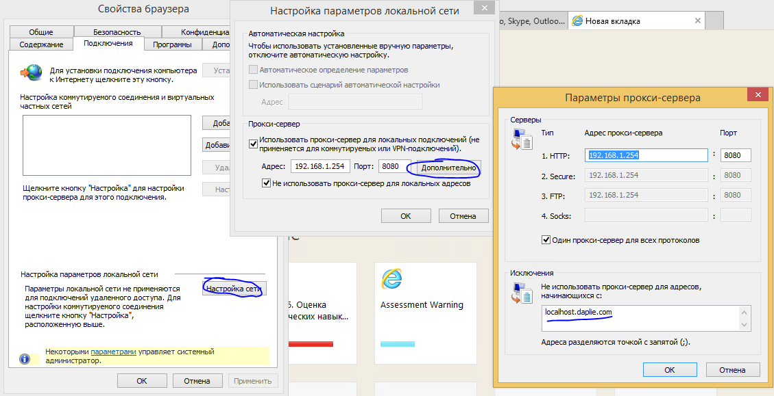 - Яндекс: Настройки -> Показать дополнительные настройки -> Изменить настройки прокси-сервера.