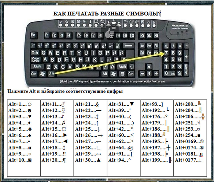 Только цифры нужно набирать на цифровой клавиатуре и после отжатия клавиши Alt нужный символ отображается в любой программе или браузере. Вот коды нескольких знаков: