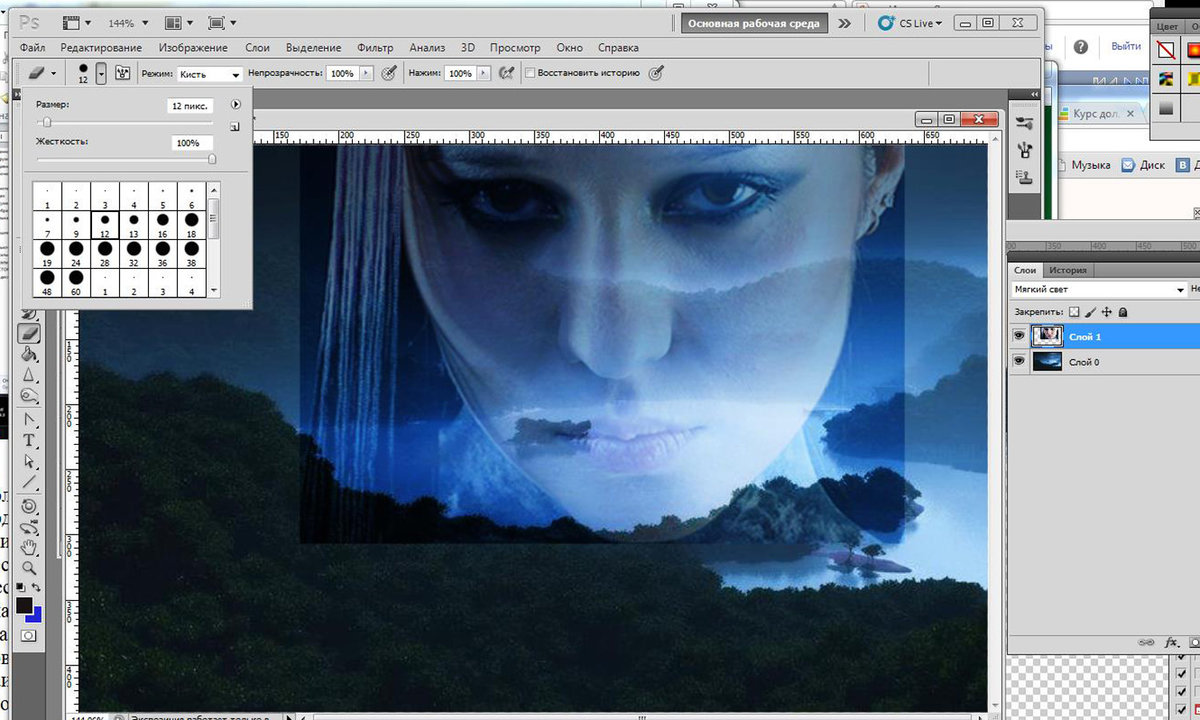 Резинкой сотрите в нужных местах части верхнего изображения и, когда закончите, для этого слоя верните параметр Opacity (Непрозрачность) 100%. Слой станет непрозрачным, но те места, где прошлись резинкой будут полностью или частично прозрачными.