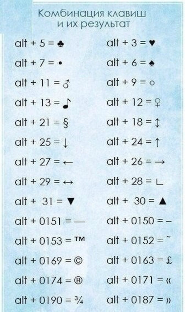 Всё просто:нужно перейти на английский язык, затем нажать клавишу Alt с правой стороны и, удерживая её, набрать комбинацию цифр в правом ряду (под Num Lock). Отпускаем клавишу Alt – в тексте появляется нужный нам символ.