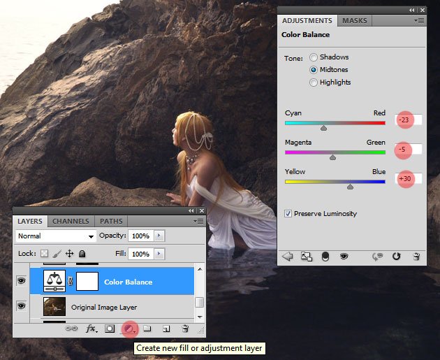 Чтобы быстро повысить насыщенность цветов, мы снова прибегнем к помощи корректирующих слоёв. Кликните по соответствующему значку в нижней части панели слоёв.