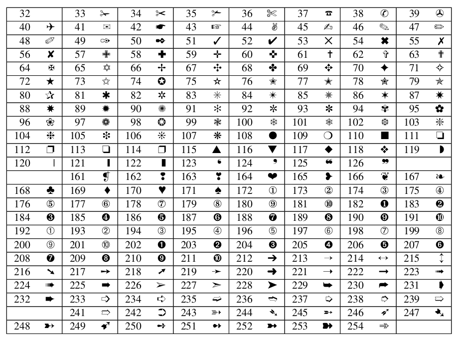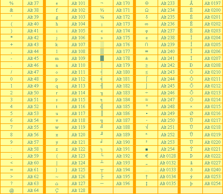 Полный список символов см. в таблице символов на компьютере, таблице кодов символов ASCII или таблицах символов Юникода, упорядоченных по наборам.