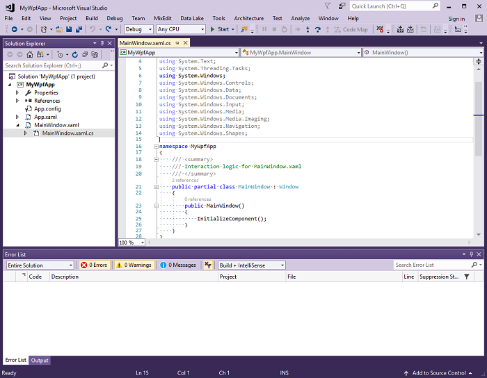 Сначала вы создадите проект приложения Visual Basic. Шаблон проекта по умолчанию содержит все файлы, необходимые для готового к запуску приложения.