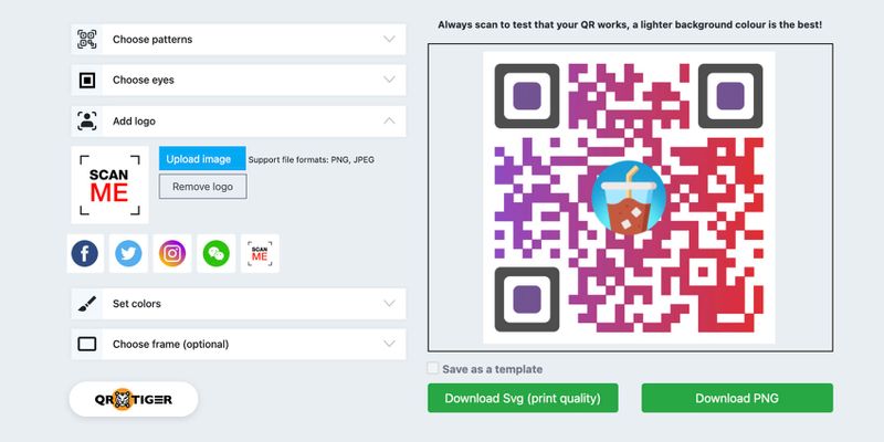 - Выберите несколько узоров, глаз, добавьте логотип и установите цвета, чтобы сделать ваш QR-код привлекательным.
