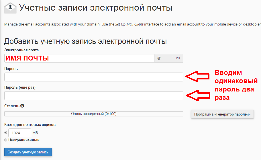 - Вы также можете отправить приветственное электронное письмо с инструкциями по настройке почтового клиента.По умолчанию эта опция отмечена. Если вы не хотите отправлять электронное письмо, просто снимите флажок.