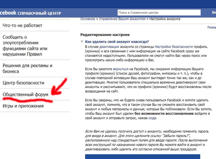 Информация FacebookНажмите «Деактивация и удаление»