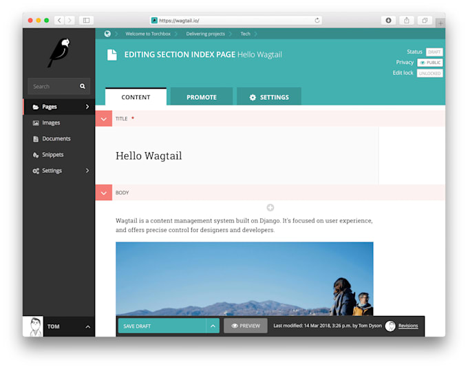 В wagtail очень удобно работать с контентом, создавать новые публикации, разделы, работать с изображениями. Внутри этого проекта много интересных технологий.