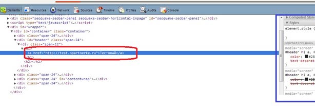 Остальная часть панели показывает HTML-код страницы в виде дерева. Прямо слева от каждого узла есть стрелочка, нажатие на которую раскрывает узел. Если при нажатии на стрелочку удерживать кнопку Alt, раскрываются и узел, и все его потомки.