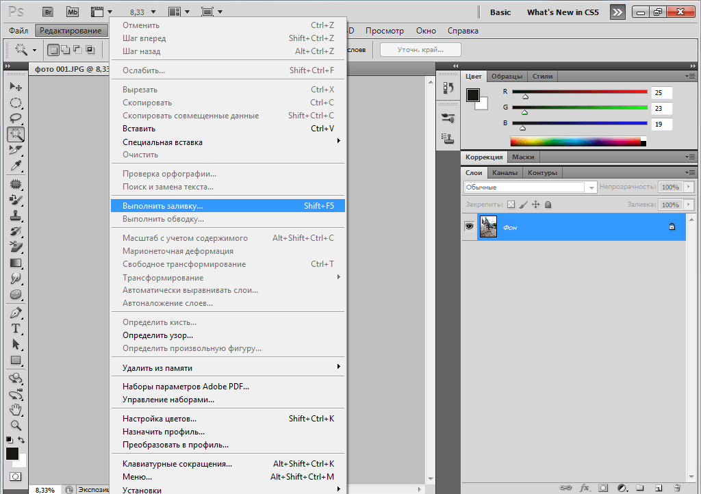 Затем выберите любой из инструментов выделения в левом столбце. Щелкните правой кнопкой мыши по вашему выбору и нажмите Заполнить.