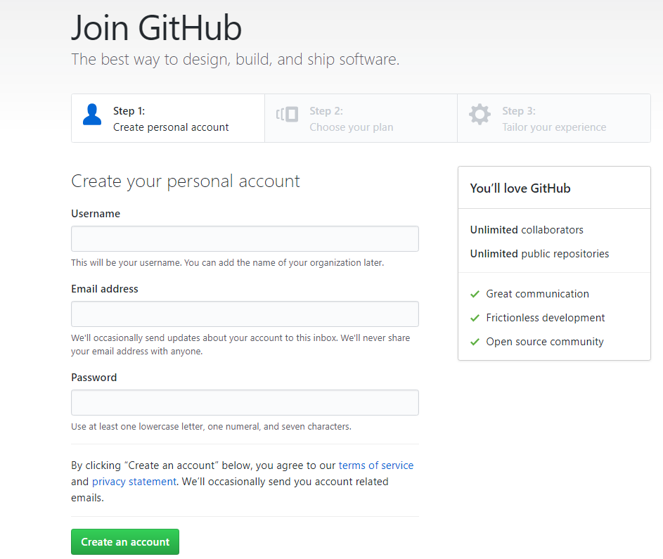 Итак, зарегистрироваться на GitHub очень просто: надо ввести имя, почту и придумать пароль. Например: