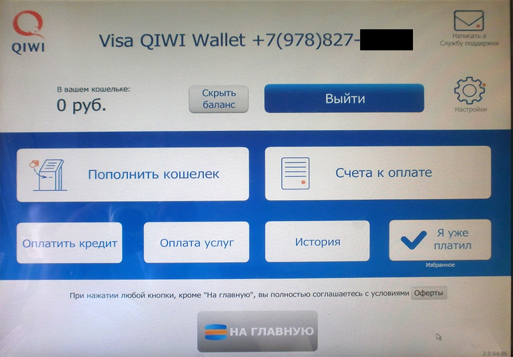 На терминале откроется личный кабинет QIWI. В нем вы сможете пополнить баланс, сделать перевод или оплатить более 20 000 услуг.