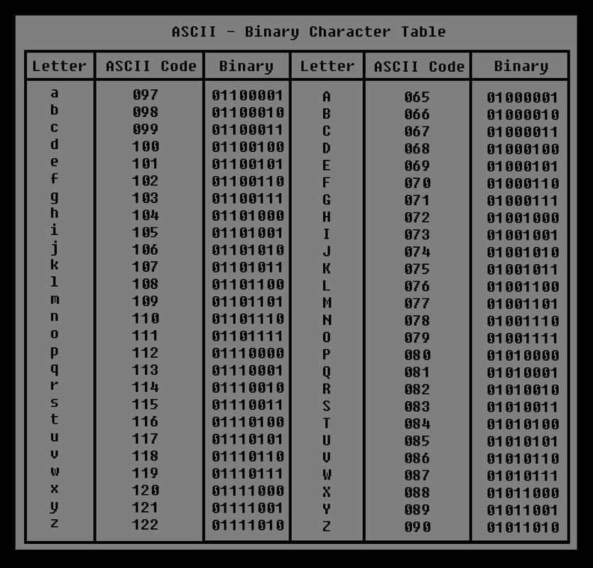 ASCII представляет собой кодировочную таблицу печатных символов (см. скриншот №1), набираемых на компьютерной клавиатуре, для передачи информации и некоторых кодов. Иными словами происходит кодирование алфавита и десятичных цифр в соответствующие символы, представляющие и несущие в себе необходимую информацию.