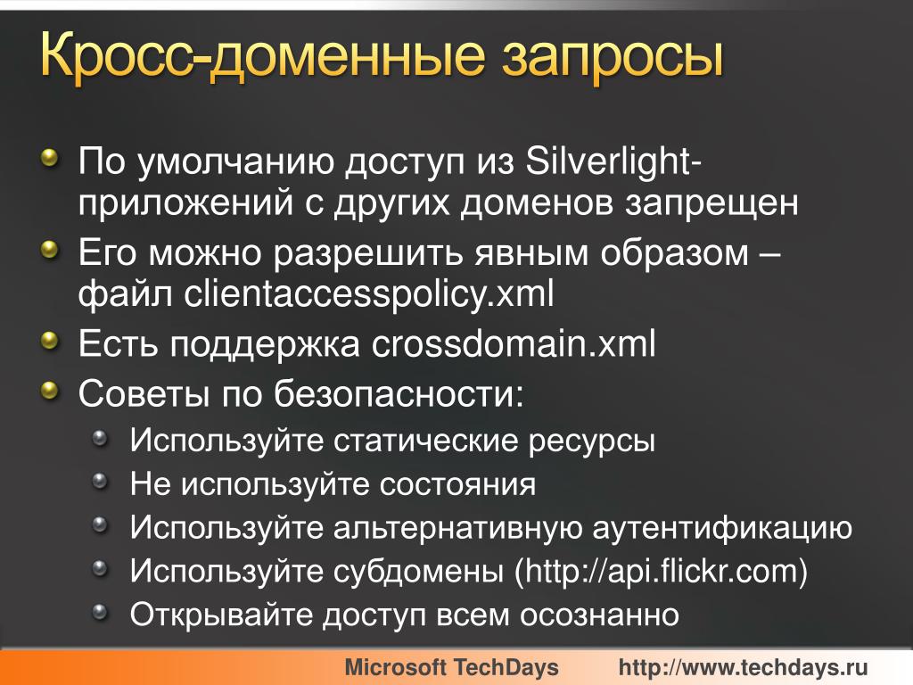 Для обеспечения безопасности пользователей веб-браузеры и Flash-клиенты блокируют пользовательские вызовы к другим доменам. Например, если клиентский код хочет обратиться к серверу s1.loadbalancedwebsite.ru, он должен быть загружен только с того же домена, s1.loadbalancedwebsite.ru. Запросы от клиентов на другие домены будут заблокированы. Для того чтобы обеспечить работоспособность описанной выше схемы балансировки, из клиентского кода на www.loadbalancedwebsite.ru требуется совершать обращения к серверам с другими доменами (например, к s1.loadbalancedwebsite.ru).