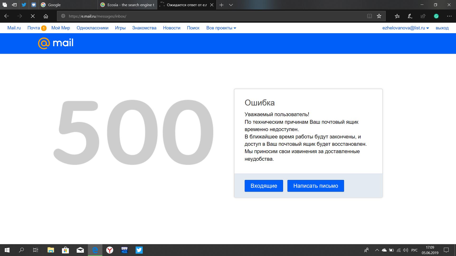 - Видите ошибку 500 в майл почте (mail.ru)? Судя по количеству запросов, для них это стандартная ситуация. Просто подождите некоторое время и почта снова заработает.