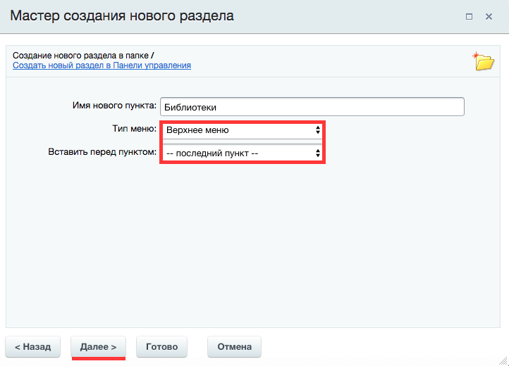 - Добавить ссылку URL: добавляет пункт меню, который ссылается на внешний URL.
