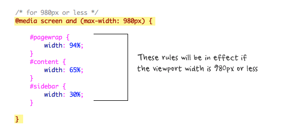 - Относительная ширина. Когда вы устанавливаете фиксированную ширину макета, скажем, в 960 пикселей, это подойдет для настольных компьютеров, лэптопов и некоторых особо крупных планшетов. Однако для мобильного телефона такой размер контейнера слишком большой. Используя медиа-запрос, можно специально для смартфонов создать «резиновый» макет, ширина которого будет не фиксированной, а относительной. Таким образом, контейнер шириной 100% будет легко подстраиваться под любой смартфон в любой ориентации.