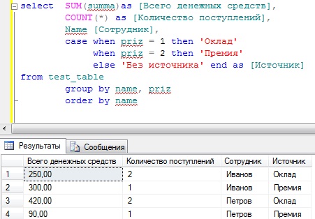Рассмотрим группировку по ОДНОМУ столбцу. Пример: