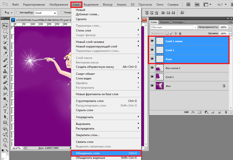 Объединение слоев в фотошопе можно выполнить следующими способами: