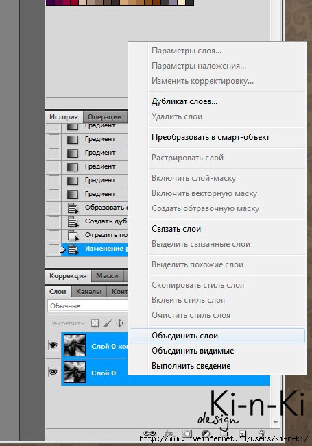 - Для начала нужно выделить нужные слои с помощью клавиши CTRL, в контекстном меню выбираем объединить слой. Недостаток этого метода в том, что его больше нельзя разбить на отдельные слои, он является целым слоем. А иногда важно, что бы слои можно было отдельно редактировать.