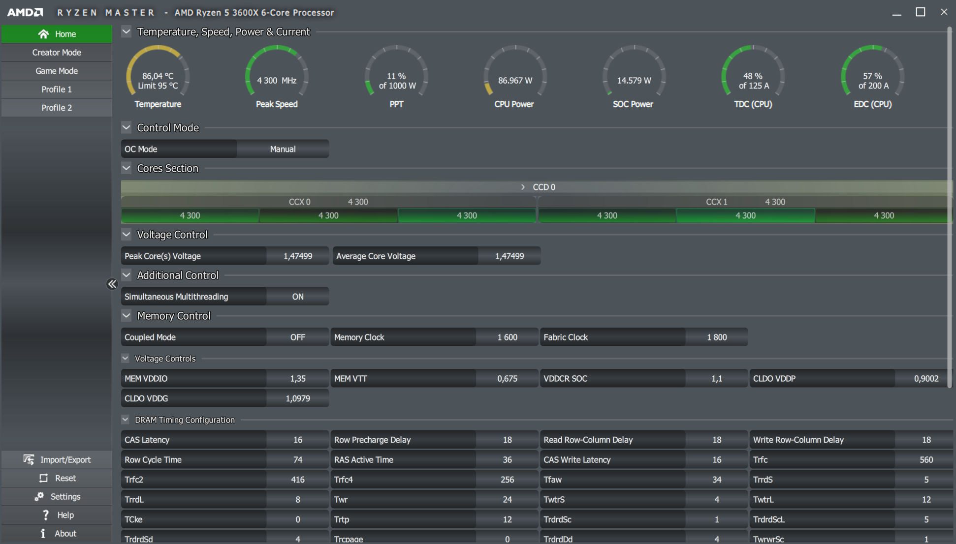 System MonitoringAccurate hardware status updates are vital, so AMD Ryzen Master has you covered with both real-time monitoring and a histogram of per-core clock rates and temperature, including average and peak readings.