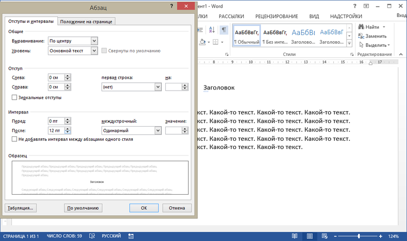 Диалоговое окно Абзац содержит общие параметры, а также настройки отступов и интервалов. В его нижней части приводится образец применения параметров.