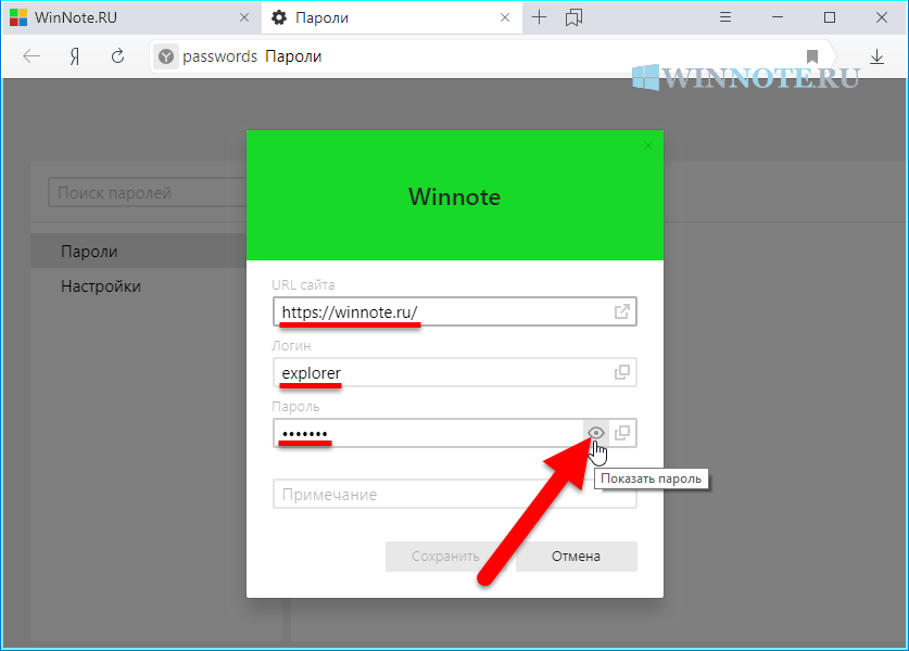 Просмотр пароля в обозревателе Яндекс.Браузер