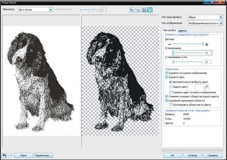 Постеризация (10-100) − предварительное упрощение рисунка за счёт объединения близких по цвету пикселов.