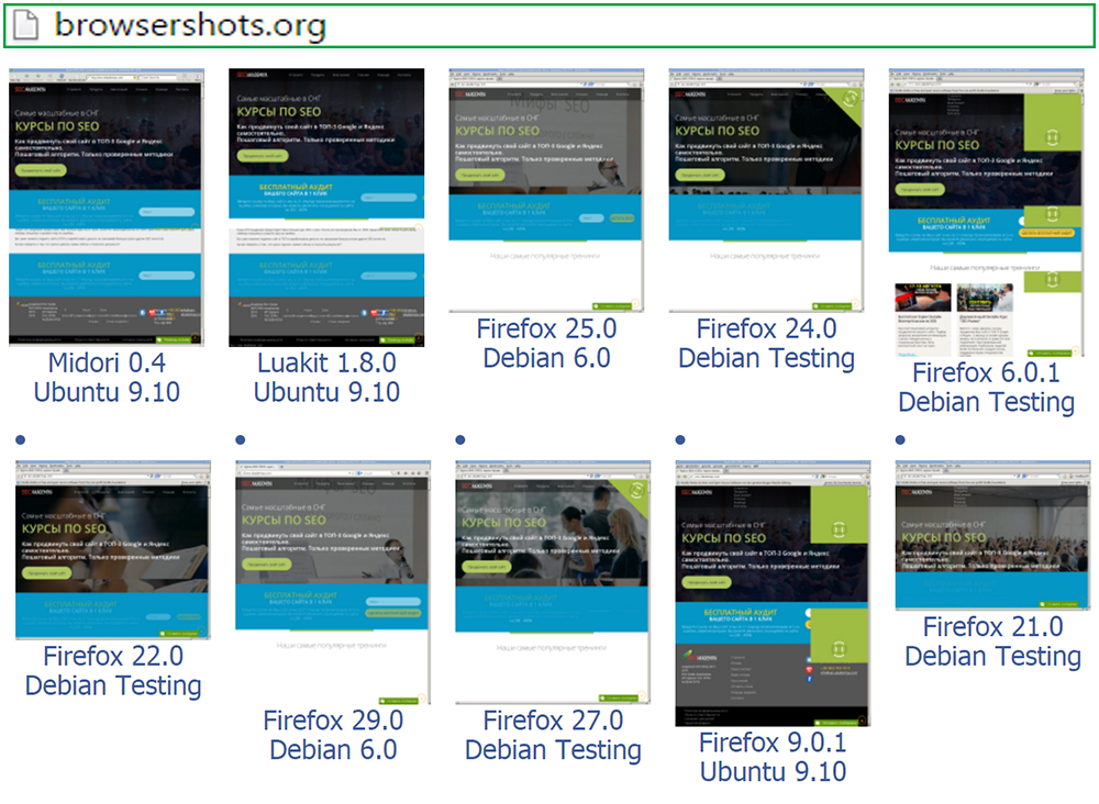 Для тестирования внешнего вида сайта подойдет Browsershots. Он предлагает на бесплатной основе возможность проверить отображение ресурса в большинстве стационарных браузеров: