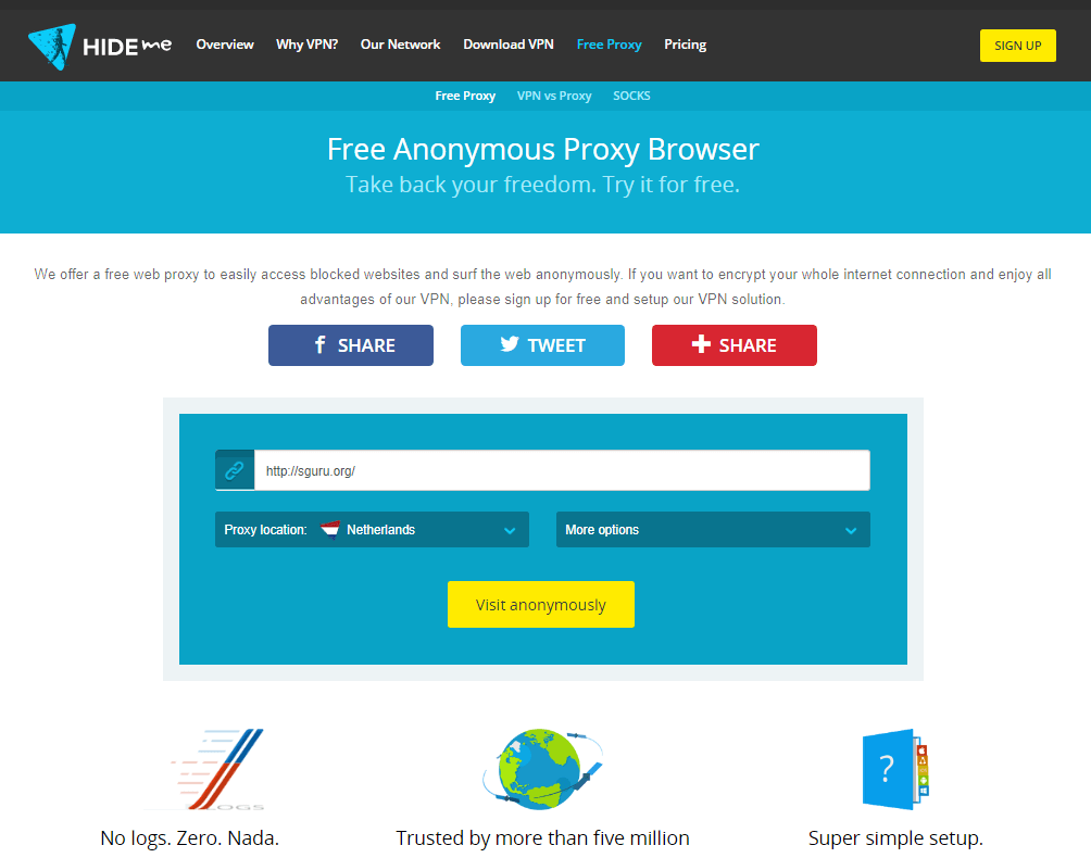 HideMe занял третье место в нашем списке бесплатных прокси-серверов. Это позволяет пользователям из более чем 2000 мест скрывать свои IP-адреса. Платформа не сохраняет никаких IP-адресов и разрывает ссылку браузера, когда сеанс просмотра заканчивается.