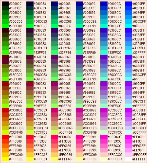 Шестнадцатиричная система задания цветов в HTML основана, как следует из ее названия, на цифре 16. Цифры, входящие в систему, составляют от 0 до 9 и латинскими буквами обозначены числа от 10 до 15. Соответствия между числами в десятиричной и шестнадцатиричной системах приведены в справочных таблицах.