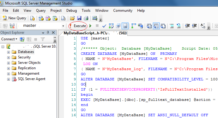 - Затем нажмите Выполните и нажмите Обновить [ ], и база данных магматических не будет отображаться в Object Explorer