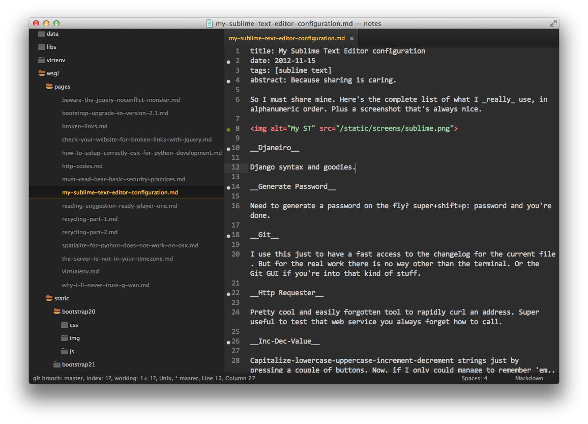 В течение жизни разработчика инструменты работы будут меняться много раз. Особенно это касается текстового редактора; который часто похож на уютный дом для опытного застройщика. Некоторые предпочитают чистые текстовые редакторы, некоторые предпочитают IDE, некоторые (например, я) предпочитают более гибридный подход, текстовый редактор, который обладает высокой расширяемостью и обеспечит большинство преимуществ IDE без накладных расходов.Для меня предпочтительным редактором является Sublime Text 3, решение, которое подтвердилось, когда я открыл для себя кодирование Zen.