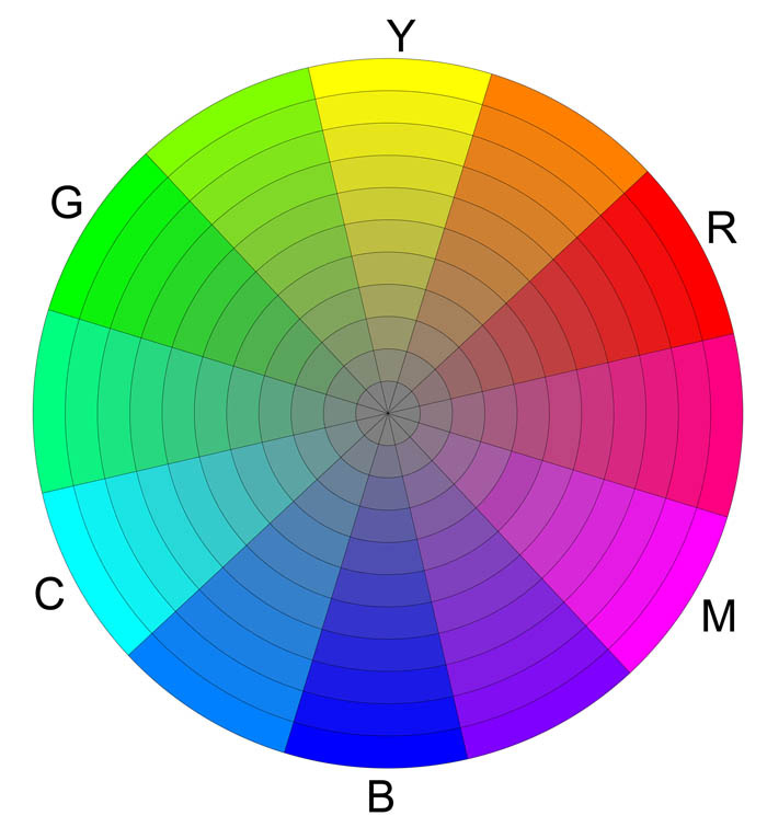 Цифровые экраны, подобные этому, используют метод аддитивного цвета, начиная с черного, а затем смешивая различное количество цветного света, они могут создавать все цвета в спектре видимого света. В этом цветовом круге основными цветами являются красный, зеленый и синий.